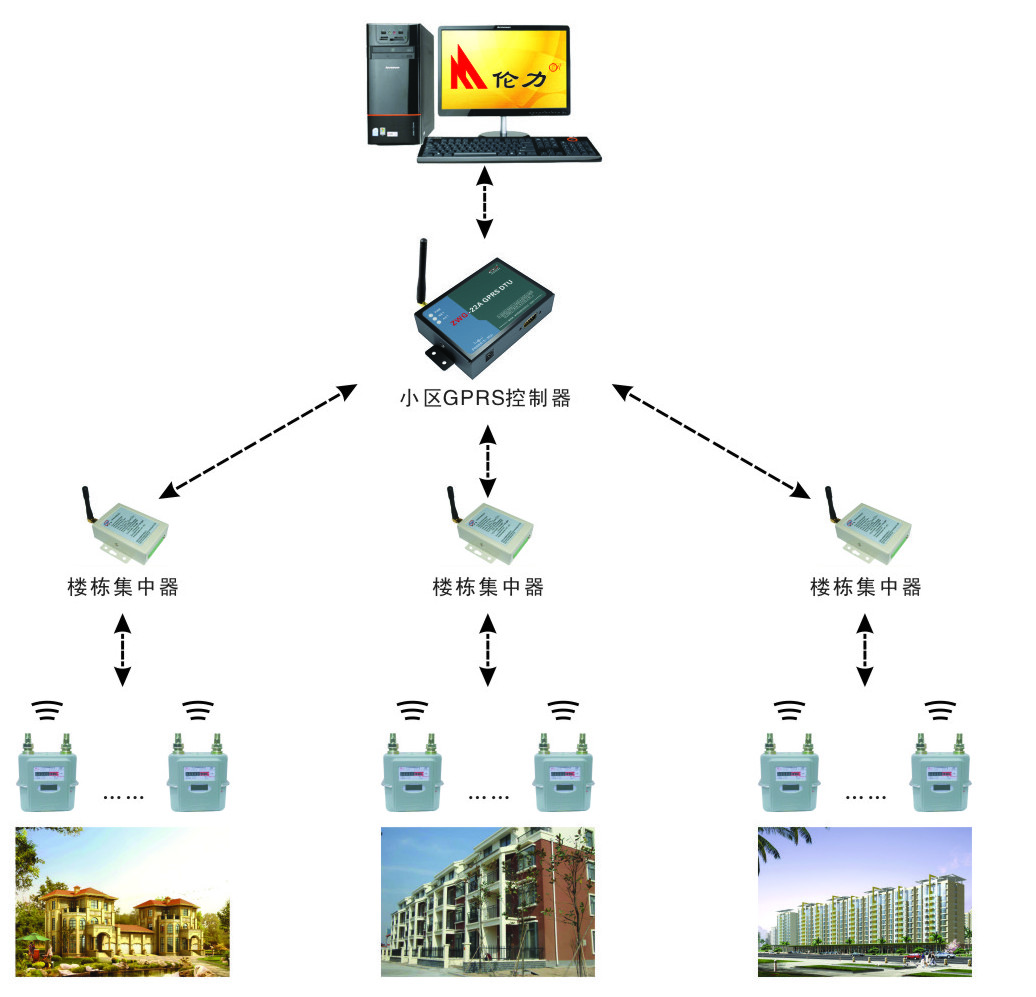 GPRS集中器:集中器收集其无线通讯范围内的各种采集器中的数据,并利用无线GPRS业务将其采集到的无线燃气表数据传输到燃气管理部门。